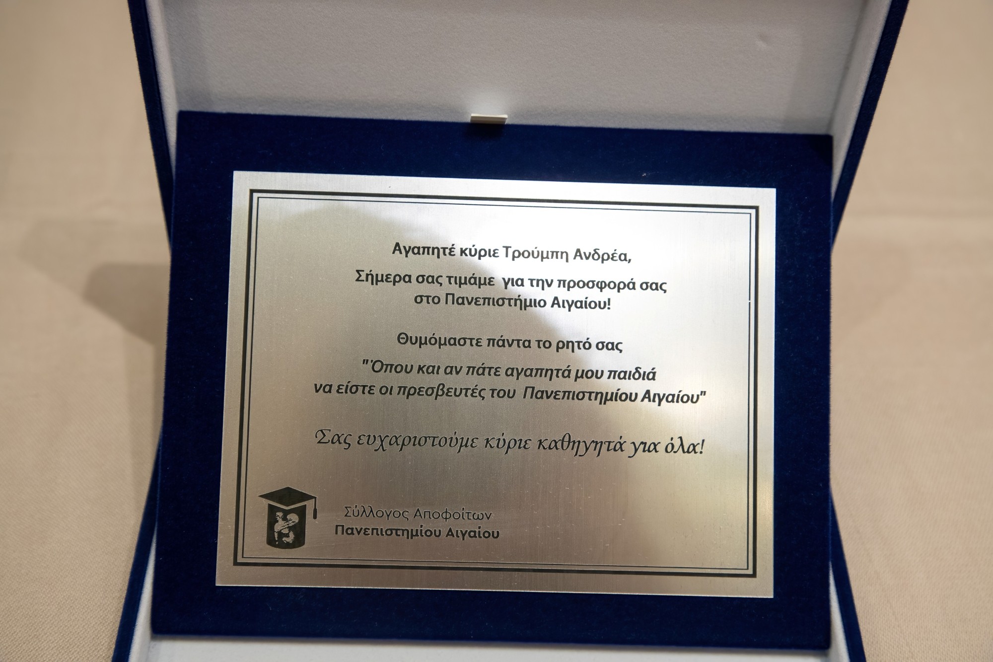 Κορυφαία στιγμή της εκδήλωσης υπήρξε η βράβευση του πρώην Πρύτανη, καθηγητή Ανδρέα Τρούμπη, από τον ΣΑΠΑ, για την πολυετή προσφορά του στο Πανεπιστήμιο. Τον τιμώμενο προσφώνησαν διακεκριμένες προσωπικότητες του ακαδημαϊκού και πολιτικού χώρου, μεταξύ των οποίων ο ομότιμος καθηγητής ΕΚΠΑ και μέλος της Ακαδημίας Αθηνών Γιώργος Χρούσος, ο καθηγητής Παναγιώτης Δημητρακόπουλος, ο καθηγητής Μανούσος Μαραγκουδάκης και ο πρώην βουλευτής και νομάρχης Λέσβου Παύλος Βογιατζής.