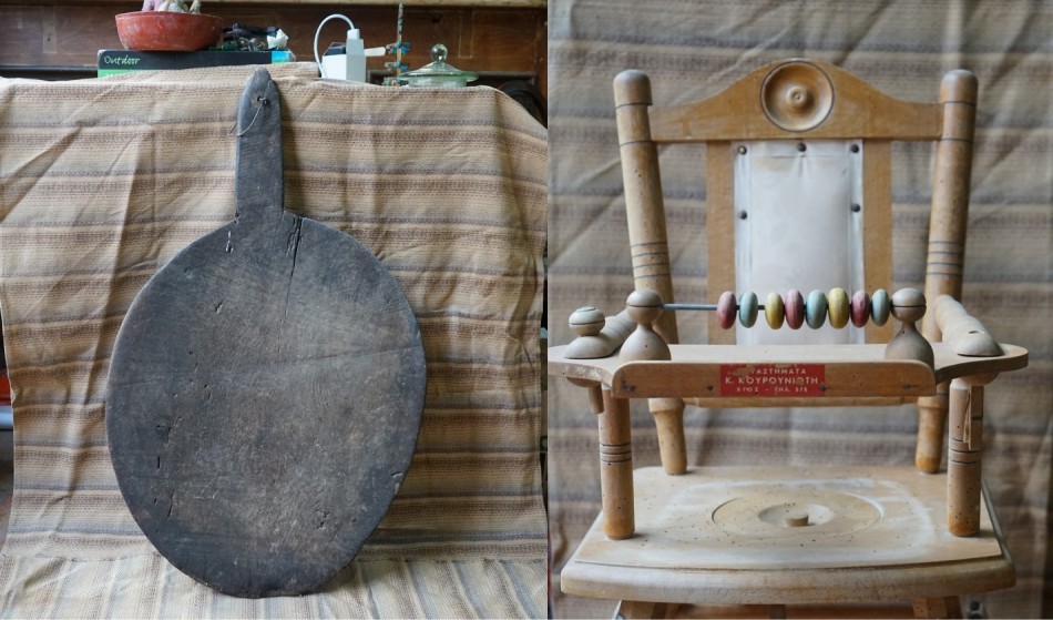 Επίσης ένα χρηστικό αντικείμενο που δεν έλειπε από κανένα σπίτι που είχε νεογέννητα μωρά, ήταν το ξύλινο παιδικό καρεκλάκι. Περίτεχνο και προικισμένο με όλα τα κομφόρ, για όλες τις ανάγκες και τη διασκέδαση του παιδιού. Και αριθμητήριο είχε, και μίνι πτυσσόμενο τραπεζάκι, και παιχνίδια για να παίξει το μικρό αγγελούδι, και γινόταν και κρεβατάκι για να κοιμηθεί. Τέτοιο είναι και το παιδικό καρεκλάκι που είδαμε και στο Παλαιοπωλείο του Κώστα Πνευματικούδη, και ζωντανέψανε τα χρόνια τα παλιά.