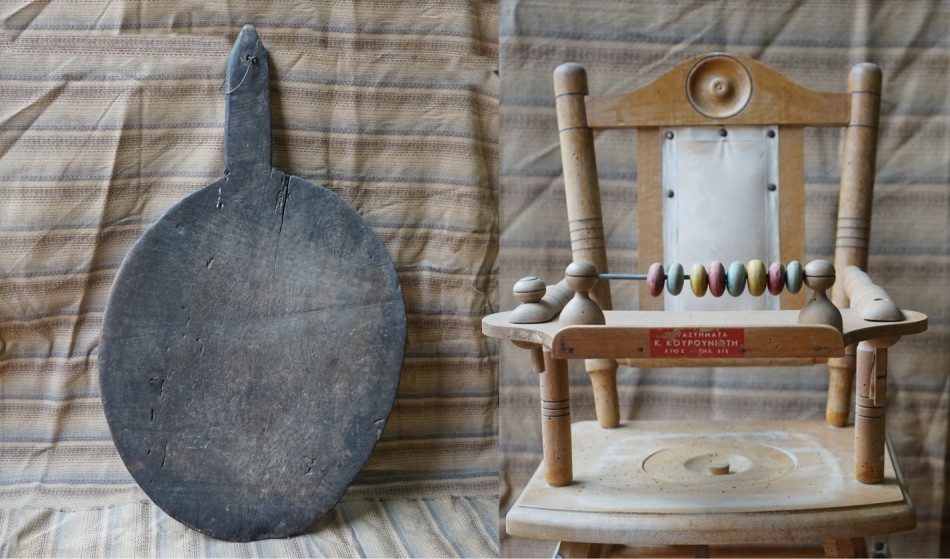 Η φουφού, το μαγκάλι, το καβουρδιστήρι του καφέ, η ξύλινη πλασταριά και το παιδικό καθισματάκι, που είχε όλα τα κομφόρ για το παιδί, με πληρότητα και απλότητα...