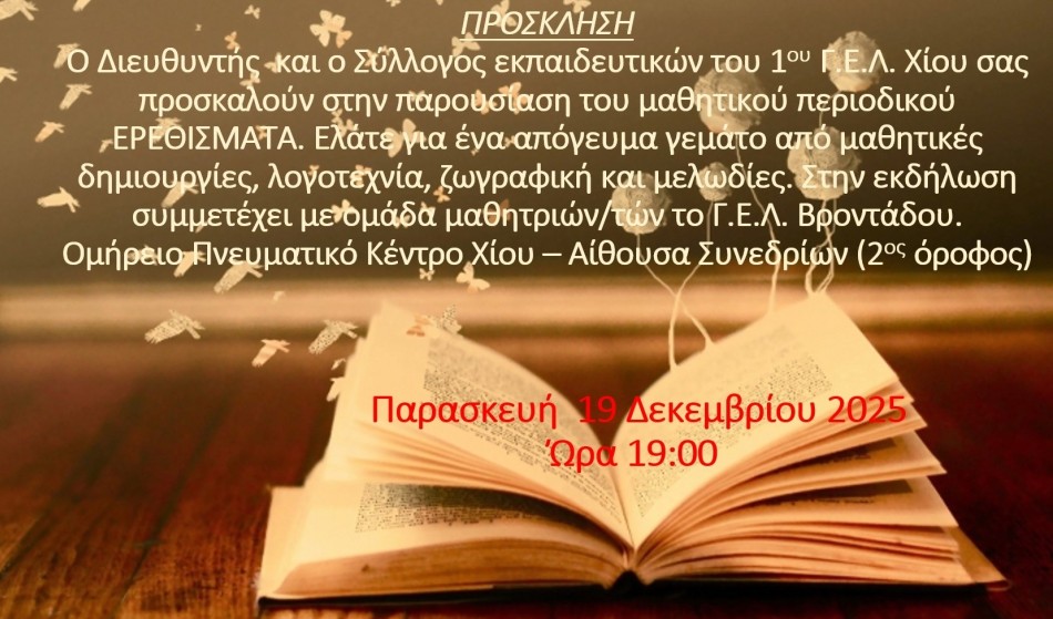 Στην παρουσίαση του μαθητικού περιοδικού «Ερεθίσματα» καλούν το κοινό ο Διευθυντής και ο Σύλλογος Εκπαιδευτικών του 1ου Γενικού Λυκείου Χίου, την Παρασκευή 19 Δεκεμβρίου, στις 7 το απόγευμα, στην Αίθουσα Συνεδριάσεων του Ομηρείου Πνευματικού Κέντρου Χίου (2ος όροφος).