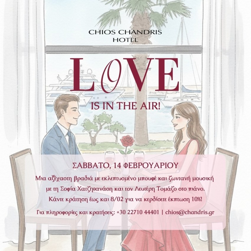 Η Ημέρα του Αγίου Βαλεντίνου πλησιάζει και στο Chios Chandris σας προσκαλούμε να ζήσετε μια απόλυτα ρομαντική εμπειρία φιλοξενίας! Κάντε την κράτησή σας τώρα για μια μαγευτική διαμονή με θέα στη θάλασσα και δείπνο με κεριά στο εστιατόριό μας, συνοδεία ζωντανής μουσικής από τη Σοφία Χατζηθανάση και τον Λευτέρη Τομάζο στο πιάνο.
