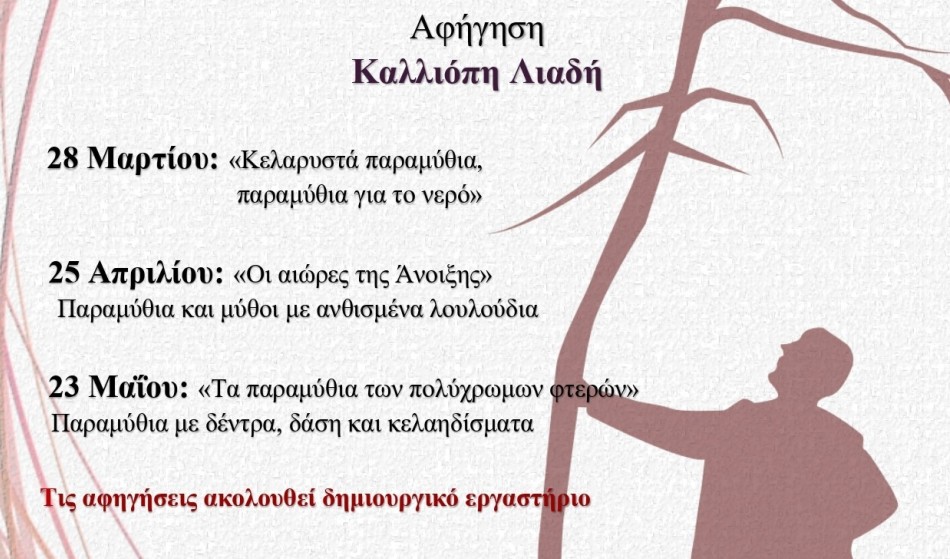 Η έναρξη του κύκλου θα γίνει την άνοιξη, με κεντρικό θεματικό άξονα τη φύση. Το πρόγραμμα περιλαμβάνει το Σάββατο 28 Μαρτίου την αφήγηση «Κελαρυστά Παραμύθια! Παραμύθια για το νερό», το Σάββατο 25 Απριλίου τις «Αιώρες της Άνοιξης», με μύθους και παραμύθια γεμάτα ανθισμένα λουλούδια, και το Σάββατο 23 Μαΐου τα «Παραμύθια των πολύχρωμων φτερών», με ιστορίες από δέντρα, δάση και κελαηδίσματα. Όλες οι συναντήσεις θα ξεκινούν στις 6 το απόγευμα.