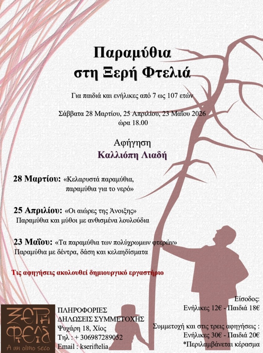 Έναν νέο κύκλο αφηγήσεων για παιδιά και ενήλικες εγκαινιάζει η Ξερή Φτελιά στη Χίο, μετατρέποντας έναν Σάββατο κάθε μήνα τον χώρο της σε σημείο συνάντησης για όσους θέλουν να ταξιδέψουν στον κόσμο των μύθων και των παραμυθιών.