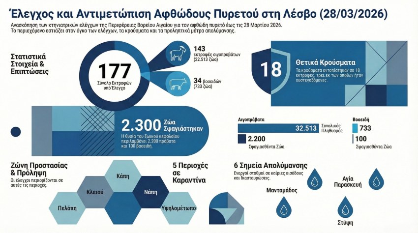 Σε 177 εκτροφές ζώων στη Λέσβο, συνολικής δυναμικότητας 33.246 ζώων, έχουν πραγματοποιηθεί μέχρι και το Σάββατο 28 Μαρτίου 2026 οι έλεγχοι για την αντιμετώπιση του αφθώδους πυρετού, σύμφωνα με τα επίσημα στοιχεία που έδωσε στη δημοσιότητα η Περιφέρεια Βορείου Αιγαίου. Από τους ελέγχους που διενεργήθηκαν, εντοπίστηκαν θετικά κρούσματα σε 18 εκτροφές, ενώ έχουν ήδη σφαγιαστεί 2.200 πρόβατα και 100 βοοειδή.