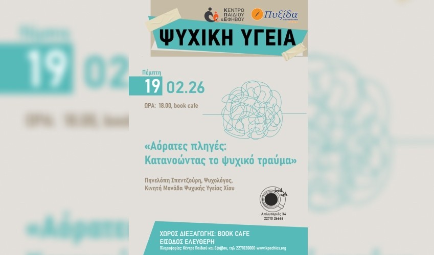Το Κέντρο Παιδιού και Εφήβου σας προσκαλεί σε μια ανοιχτή ομιλία και συζήτηση με θέμα «Αόρατες Πληγές: Κατανοώντας το Ψυχικό Τραύμα», την Πέμπτη 19 Φεβρουαρίου 2026, στις 18:00, στο Book Café του Βιβλιοπωλείου Πυξίδα στη Χίο.