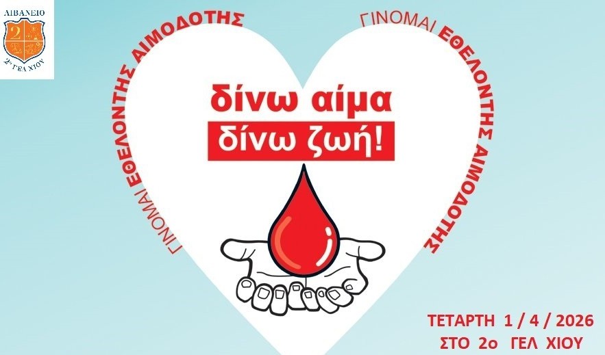 Το 2ο Γενικό Λύκειο Χίου «Λιβάνειο» διοργανώνει δράση εθελοντικής αιμοδοσίας την Τετάρτη 1 Απριλίου 2026, από τις 09:00 το πρωί, στους χώρους του σχολείου.