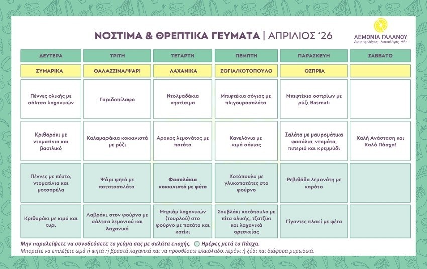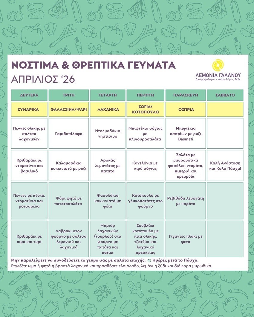 Η Λεμονιά Γαλανού, Διατροφολόγος-Διαιτολόγος MSc με ειδίκευση στην Κλινική - Ιατρική Διατροφή, Ιατρική Σχολή ΑΠΘ προτείνει ένα μηνιαίο συνταγολόγιο και διατροφικές συμβουλές, βοηθώντας σας να απολαύσετε νόστιμα και υγιεινά γεύματα καθημερινά, ώστε να διατηρήσετε την υγεία και την ευεξία σας.